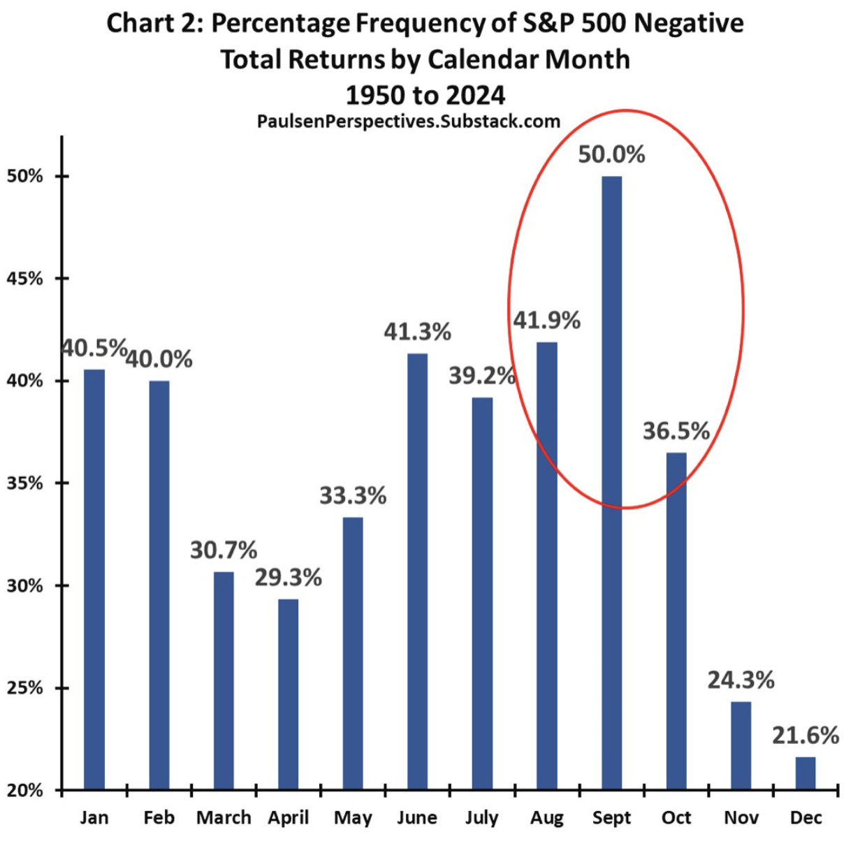 La part des mois négatifs à Wall Street augmente à partir de juin et trouve son pic en septembre (50%), avant de redescendre au plus bas en décembre (21,6%).